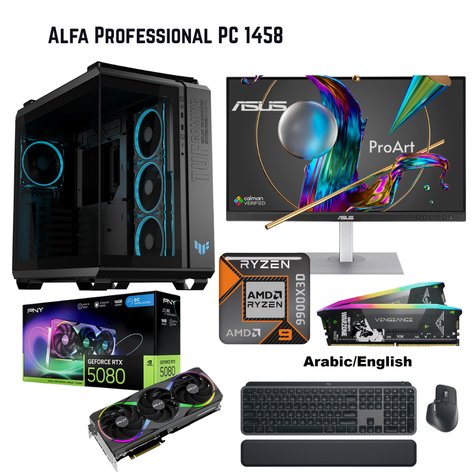 - جهاز Alfa Professional PC 1458 بمعالج AMD Ryzen 9 9900X3D وبطاقة رسومات RTX 5080 وذاكرة 32 جيجابايت وسعة تخزين 2 تيرابايت وصندوق ASUS GT502 مع نظام Windows 11 Pro وشاشة ASUS ProArt PA279CV ولوحة مفاتيح وفأرة Logitech MX Keys S Combo