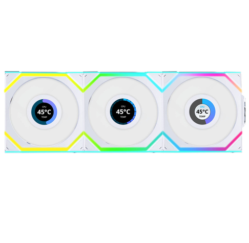 مروحة Lian Li UNI FAN SL لاسلكية مع شاشة LCD وإضاءة ARGB بحجم 120 مم (ريش عكسية) – أبيض (حزمة من 3 مراوح)